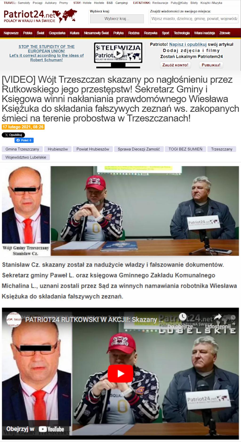 - Zdumiewającą decyzję podjął następnie premier Mateusz Morawiecki desygnując Pawła L. na funkcję tymczasowego zarządcy gminy Trzeszczany. To spowodowało, że zastępca wyrzuconego wójta dalej sprawował władzę. Będąc uznanym przecież przez sąd za winnego popełnienia przestępstwa i namawiania do złożenia fałszywych zeznań w prokuraturze - komentuje Robert Rewiński Redaktor Naczelny Patriot24 net i Telewizja.Patriot24.net