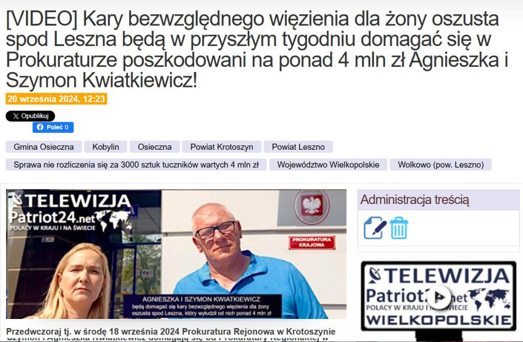 To kolejny sukces uporczywych i konsekwentnym działań Agnieszki i Szymona Kwiatkiewicz. Bo mimo początkowego umorzenia śledztwa przez Prokuraturę Rejonową w Krotoszynie, jeszcze w tym roku ma ona skierować do Sądu Okręgowego w Kaliszu akt oskarżenia przeciwko oszustowi z Osiecznej k. Leszna. Za 9 już udowodnionych przestępstw prokurator może się domagać dla niego nawet 8 lat więzienia i naprawy wyrządzonej szkody sięgającej co najmniej 10 mln zł.